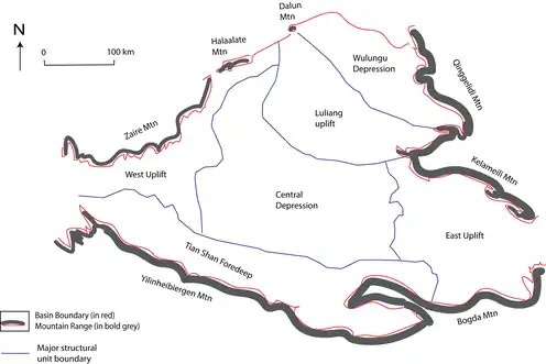 The Junggar Basin (simplified Chinese: 准噶尔盆地; traditional Chinese: 準噶爾盆地) is one of the largest sedimentary basins in Northwest China. It is located in Xinjiang,[1] and enclosed by the Tarbagatai Mountains of Kazakhstan in the northwest, the Altai Mountains of Mongolia in the northeast, and the Heavenly Mountains (Tian Shan) in the south.[1][2] The geology of Junggar Basin mainly consists of sedimentary rocks underlain by igneous and metamorphic basement rocks.[3] The basement of the basin was largely formed during the development of the Pangea supercontinent during complex tectonic events from Precambrian to late Paleozoic time.[4] The basin developed as a series of foreland basins – in other words, basins developing immediately in front of growing mountain ranges – from Permian time to the Quaternary period.[1] The basin's preserved sedimentary records show that the climate during the Mesozoic era was marked by a transition from humid to arid conditions as monsoonal climatic effects waned.[2] The Junggar basin is rich in geological resources (e.g. petroleum, coal and ore deposits) due to effects of volcanism and sedimentary deposition.[3][5] According to Guinness World Records it is a land location remotest from open sea with great-circle distance of 2,648 km (1,645 miles) from the nearest open sea at 46°16′8″N 86°40′2″E.[6]