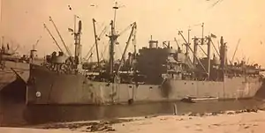 The ship was declared surplus and placed custody of the Maritime Commission 20 August 1947 for disposal, first in the reserve fleet at Brunswick, Georgia then in the James River in Virginia. On 1 July 1949 the ship, converted to a barge in 1946 and not self propelled, was sold to Eastern Transportation Company.[7][8] Renamed Kathleen Sheridan the barge sank at the dock at Arthur Kill, Perth Amboy, New Jersey in 1964.[8]
