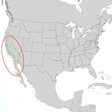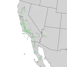 As the name implies, it is mainly in numerous California habitats, although its range also extends through most of Baja California, a short distance into the Great Basin in southern Nevada, and into northwestern Arizona. In California it is found in: the Peninsular Ranges, Transverse Ranges, California Coast Ranges, Sacramento Valley foothills, Sierra Nevada, and at higher elevation sky islands in the Mojave Desert ranges.[6][7] It is also found off of the North American continental shelf, on Guadalupe Island in the Pacific Ocean, where there are less than 10 individuals.[8][9]