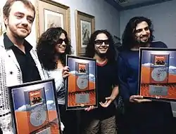 Junoon (Urdu: جنون transl. Obsession/Passion) is a Pakistani sufi rock band from Lahore, Punjab, Pakistan, and Tappan, New York, formed in 1990.[1] The band is directed by founder, lead guitarist and songwriter, Salman Ahmad, who was soon joined by keyboardist Nusrat Hussain, bass guitarist Brian O’Connell and vocalist Ali Azmat.[2] Junoon is Pakistan's and one of South Asia's most successful bands.[3] Since their inception, the group has released a total of nineteen albums: seven studio albums; one soundtrack; two live albums; four video albums; and five compilations.[4] They have sold over 30 million records worldwide.[5][6]