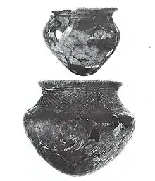 1,713 sherds were recovered, representing at least 631 vessels. This pottery is characterized by rounded, generally squat vessels with well-defined shoulders and tempered by coarse grit temper. Surface finish is generally cord-wrapped paddle impressed with decorations applied by cord-wrapped paddle or twisted cords and punctates. No collars or castellations appear during this phase. Similar pottery dating to the Late Woodland has been reported from the Heins Creek site in Wisconsin.[4][9]
