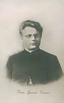 After graduation, Tumas had to choose university or priest seminary. He doubted his calling for priesthood and considered studying veterinary in Saint Petersburg.[13] His family's wishes and his poor health decided that he applied to the Kaunas Priest Seminary.[14] He had no particular calling for the theology studies and especially struggled with Latin: before entering the seminary, he knew no Latin and there were no Lithuanian or Russian dictionaries, thus he had to use a Polish–Latin dictionary but he did not know Polish either.[15] Lithuanian language was taught by Kazimieras Jaunius who provided little practical knowledge but inspired his students.[16] Lithuanian students, including Tumas, organized a secret society with a goal of translating and publishing various Lithuanian religious texts. It became known as the Society of Saint Casimir when one of its members obtained relics of Saint Casimir, the patron saint of Lithuania.[17] Catholic periodical Žemaičių ir Lietuvos apžvalga (Samogitian and Lithuanian Review) appeared in October 1889 and Tumas contributed articled on Catholic and Lithuanian topics.[18] His first contribution to the Lithuanian press was a correspondence to either Varpas in 1889 or Žemaičių ir Lietuvos apžvalga in 1890.[13]