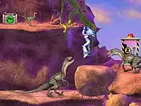 The character advances to an underwater cavern, where raptors and stegosaurs are encountered and must be captured or avoided. The character then discovers a steep ravine and is knocked over a cliff by a Pteranodon. The character climbs the cliff, jumping over many gaps while avoiding pterosaurs. At the top of the cliff, the character escapes baby pteranodons and a Tyrannosaurus rex. The T. rex then chases the character and falls down a pit after it crosses an unstable bridge, but survives. The character goes into the jungle and avoids additional dinosaurs, before going down a waterfall.