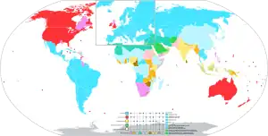 | Examples | Australia, United Kingdom (except Scotland), Israel, India, Cyprus, Nigeria, Republic of Ireland, Singapore, Hong Kong, United States (except Louisiana), Canada (except Quebec), New Zealand, Pakistan, Malaysia, Bangladesh | Continental Europe (except Andorra, including Armenia, Azerbaijan, Georgia), Latin America (except Guyana, Belize and Cuba), East Asia (except Hong Kong, China, North Korea, Vietnam and Laos), North Africa, Francophone and Lusophone Africa, Kuwait, Iraq, Turkey, Egypt, Lebanon, Quebec, Louisiana | Soviet Union, People's Republic of China (except Hong Kong and Macau), North Korea, Vietnam, Laos and Cuba | Saudi Arabia, Afghanistan, Iran, United Arab Emirates, Oman, Sudan, Malaysia, Pakistan and Yemen. |
