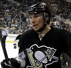 On March 26, 2013, Jokinen was placed on waivers by Hurricanes. On April 3, 2013, Jokinen was traded to the Pittsburgh Penguins in exchange for a conditional sixth- or seventh-round pick in 2013.[10] In his first game with the Penguins, Jokinen scored Pittsburgh's lone goal in regulation and tallied the only shootout goal for the team in a 2–1 victory over the New York Rangers.[11] During the 2013–14 season, on October 8, 2013, Jokinen scored his first hat-trick with the Penguins in a 5–2 win over his former team, the Carolina Hurricanes. Jokinen enjoyed his most productive season since 2010, totaling 21 goals and 57 points in 81 games with the Penguins, playing alongside Evgeni Malkin for most of the season.