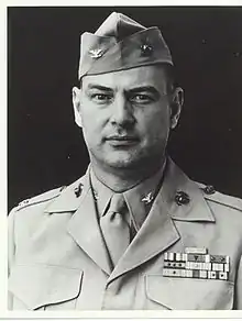 He commanded the 3rd Battalion, 25th Marines in the Roi-Namur campaign. On Saipan he suffered blast concussion, but returned to lead his battalion there and on Tinian. He had trained his command so thoroughly and his leadership was so conspicuous that he was awarded the Legion of Merit with Combat "V."[1]