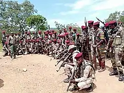 In the preceding Central African Republic Bush War (2004–2007), the government of President François Bozizé fought with rebels until a peace agreement in 2007. The current conflict arose when a new coalition of varied rebel groups, known as Séléka, accused the government of failing to abide by the peace agreements,[31] captured many towns in 2012 and seized the capital in 2013.[32] Bozizé fled the country,[33] and the rebel leader Michel Djotodia declared himself President.[34] Renewed fighting began between Séléka and militias opposed to them called Anti-balaka.[35] In September 2013, President Djotodia disbanded the Séléka coalition, which had lost its unity after taking power, and resigned in 2014.[36][37] He was replaced by Catherine Samba-Panza,[38] but the conflict continued.[39] In July 2014, ex-Séléka factions and Anti-balaka representatives signed a ceasefire agreement.[40] By the end of 2014, the country was de facto partitioned with the Anti-Balaka controlling the south and west, from which most Muslims had evacuated, and ex-Séléka groups controlling the north and east.[41] Faustin-Archange Touadéra, who was elected President in 2016, ran and won the 2020 election, that triggered the main rebel factions to form an alliance opposed to the election called the Coalition of Patriots for Change, which was coordinated by former President Bozizé.[42] Peacekeeping largely transitioned from the ECCAS led MICOPAX to the African Union led MISCA to the United Nations led MINUSCA, while the French peacekeeping mission was known as Operation Sangaris.