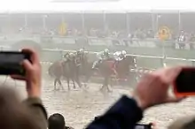 The track conditions for the 2018 Preakness Stakes, run on May 19 at Pimlico Racetrack in Baltimore, were even worse than for the Derby.[35] After heavy rain over several days, the track was sloppy.[36] The rain finally stopped shortly before the race but then a heavy fog descended, limiting visibility to about a sixteenth of a mile.[37]