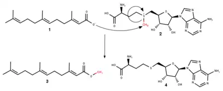 The enzyme catalyzes a putative SN2 reaction, coordinating either FA or JHA III for facile backside nucleophilic attack on the methyl group of SAM.[6] This reaction results in the formation of S-Adenosyl homocysteine (SAH) and the corresponding methyl ester. Depending on the insect's taxonomy, JHMAT is either the last or second to last step in JH III synthesis. Insects in Orthoptera, Dictyoptera, Coleoptera, and Diptera first methylate farnesoic acid to methyl farneosate with JHAMT, followed by epoxidation mediated by P450 epoxidase to yield JH III. Insects of order Lepidoptera first perform an epoxidation by P450 epoxidase to convert farnesoic acid to JHA III, followed by JHAMT-dependent methylation to produce juvenile hormone III.[5] The enzyme displays a higher affinity to JHA III compared to FA,[7] although other enzymes do exhibit the opposite substrate affinity pattern.[8]
