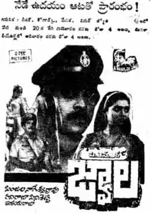 Jwala (transl. Volcano) is a 1985 Indian Telugu-language film, directed by Ravi Raja Pinisetty. The film stars Chiranjeevi in a dual role, Raadhika, Silk Smitha and Bhanupriya. The film's score was composed by Ilaiyaraaja. The film was dubbed in Malayalam as Prathikara Jwala.[1][2][3] The film was remade in Kannada in 1987 as Sathyam Shivam Sundaram starring Vishnuvardhan in triple roles ( including the role of the father) unlike this movie.
