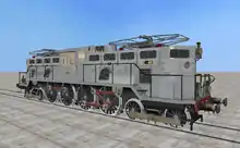 Single-phase power was supplied at 16,000 volts and 50 Hz through a single overhead line and converted to three-phase on the locomotive by a rotary phase converter.[15] The drive motors, made by Metropolitan-Vickers, had a very large diameter of 3 meters and incorporated four sets of 24 magnetic poles each, which could be added to the traction effort at will, producing highly efficient constant speeds of 25, 50, 75 and 100 km/h over rail (or 17/34/51/68 km/h for the V60 heavy freight train engine variant, which had six pairs of smaller driving wheels).