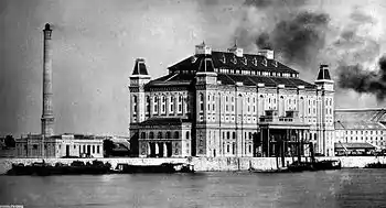 Between 1880 and 1883, several warehouses were established in the city suitable for the storage of 50 thousand tons of grain. Consequently, this investment boosted the local grain trade, and contributed significantly to the growth of Budapest as a centre of the milling industry. With the rental of these warehouses, and the tax revenues, the city avoided long-term indebtedness, even after borrowing large amounts of money.[27] A bucket elevator ("Elevátor") was also built in 1881 in the Boráros Square (today in Ferencváros), which functioned until World War II. Despite the fact that it was an urban project, the city administration leased the Elevator to the Hungarian Exchange Bank for sixty years.[30]