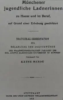 Mende obtained a doctorate degree with Lujo Brentano, graduating with a dissertation entitled "Münchener jugendliche Ladnerinnen zu Hause und im Beruf, auf Grund einer Erhebung geschildert". The doctoral dissertation was of a sociological nature and analysed the private and professional lives of young female shopkeepers in Munich. Today it is thought to be one of the earliest sociological analyses in Germany.[2]
