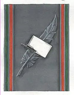 Silver rectangle bordered to left and right by green and red stripes; cast in the middle by an oriented silver quill broached by a Képi Blanc.