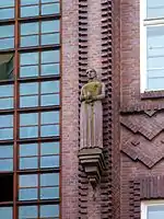 East of the park at Am Köllnischen Park 3 is a large office building which was designed by Alfred Messel as the headquarters of the Landesversicherungsanstalt Berlin, the social insurance for Berlin within Bismarck's old age and disability insurance system.[39] Built in 1903/04, the building echoes the Märkisches Museum, which was built at the same time, in the use of red brick on its façade and is in Expressionist-Baroque style, with giant pilasters which rise uninterrupted from the street to the roofline,[40][41] between which are limestone decorative elements in the form of similated balustrades, allegorical figures, and cartouches with craft symbols, such as an iron between pairs of scissors.[42][43] Over the southern entrance is a sculpture of a group of men in classical style with the motto "Einer für alle—alle für einen" (One for all—all for one).[44] The building originally had a tower, which was destroyed in World War II.[41] After the war it was the headquarters of the East German Social Security Administration.[45] It now houses offices of the Berlin Senate Department of Urban Development,[46] and one of the courtyards has been roofed over and houses a permanent exhibition of plans for the redevelopment of the city.[2] It forms part of an ensemble of buildings to either side of the Märkisches Museum which are registered as a city landmark.[47]