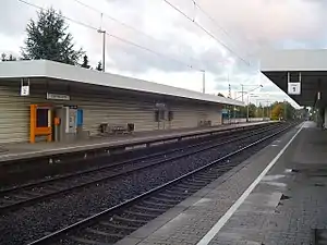 Today, the station has two side platforms with a height of 76 cm, a street-level access to each platform and stairs leading to a road underpass on the other ends of the platforms. The platform height cannot be raised to the 96 cm needed for disabled access because of the freight traffic on the line to Bergisch Gladbach. There are 87 parking bays in the car park and 20 bicycle racks.
