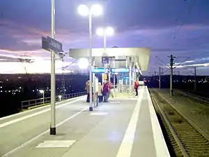 The station was built before the 2006 FIFA World Cup to relief the Stadtbahn trains from RheinEnergie Stadion (part of line 1) to the center of Cologne. When Weiden West was opened, people coming from west of Cologne could change there to the Stadtbahn instead of going via the Central Station of Cologne and use the westbound Stadtbahn to the stadium. It was opened on 28 May 2006[4] on a section of the Cologne–Aachen railway that was opened by the Rhenish Railway Company between Cologne and Müngersdorf on 6 September 1841.[6] At the same time, line 1 of the Cologne Stadtbahn was extended by about a kilometre to the west and a new terminus was built with four tracks.
