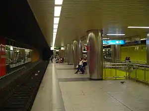 The upper level platforms are divided into a high and a low part. The high part is used by U79 trains which use high-floor light rail cars, the low part by trams of line 903 which are only equipped for low platforms. In the walls behind the tracks, there are several mirrors which lead to the impression that the platform level is larger than it actually is.