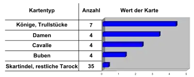 Königrufen uses the basic Tarock pack with a reduced number of cards – the full Tarock pack contains 78 cards. The 54-card pack is divided into two groups: 22 tarocks and 32 suit cards.[21]