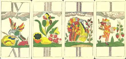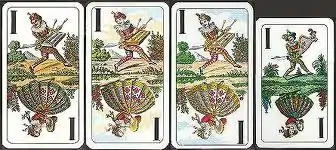 Six tarocks play a special role and are thus given names. Cards I to IIII are commonly called Birds (Vogerl or Vögel):[59][60]