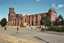 After the war, the cathedral remained a burnt-out shell and Kneiphof was made into a park with no other buildings. Before the war, Kneiphof had many buildings. One of the buildings was the first Albertina University building, where Immanuel Kant taught, which was situated next to the east side of the cathedral. New construction nearby includes the House of the Soviets.[2]