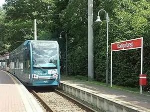 Königsforst is a terminus station on the Cologne Stadtbahn line 9, located in Cologne. The station lies in Rath/Heumar in the district of Kalk.