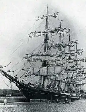 On September 21, 1928, the København departed from Nørresundby in Vendsyssel for Buenos Aires on its tenth, and ultimately final, voyage. The captain was Hans Andersen; 75 persons were aboard, including 26 crew and 45 cadets. The goal was to unload a shipload of chalk and bagged cement in Buenos Aires, take on another load of cargo and sail for Melbourne, and then bring a shipment of Australian wheat back to Europe.[2][3][4]