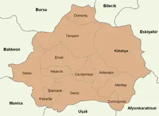 The neighboring provinces are Bursa to the northwest, Bilecik to the northeast, Eskişehir to the east, Afyon to the southeast, Usak to the south, Manisa to the southwest and Balıkesir to the west.[4]