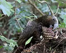 New Zealand kākā typically eat fruits, berries, seeds, flowers, buds, nectar, sap, plants and invertebrates. They use their strong beak to shred the cones of the kauri tree to obtain the seeds.[22] It has a brush tongue with which it feeds on nectar, and it uses its strong beak to dig out the grubs of the huhu beetle and to remove bark to feed on sap.[23]