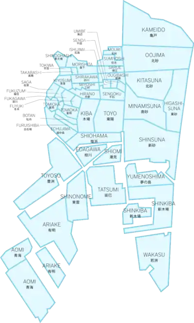 • In the former ward of Fukagawa: Kiba, Fukagawa, Edagawa;