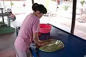 The mixture is then heated to a very high temperature in large woks over fires generated by the burning of coconut shells. While being heated, the mixture is stirred continuously to ensure even heat distribution. Traditionally, this stirring process was done manually with large wooden paddles. In larger modern manufacturing facilities, these paddles have been replaced by electric motors. The mixture eventually caramelises to a thicker texture. Recognising when the mixture has been cooked to the right level is more of an art than an exact science. While it is still hot and soft, the thickened mixture is then stringed out into moulds and allowed to cool. The final step sees the candy strings cut into rectangular lozenges, then wrapped and packaged.