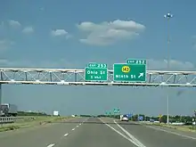 K-143's southern terminus is at a diamond interchange with I-70 in the northernmost parts of Salina, Kansas.[1] For the first 0.9 miles (1.4 km) of the route, the highway travels due north through commercial and agricultural land within the Salina city limits.[1][2][3] A short distance after this, K-143 transitions from a divided four-lane highway into a two-lane highway.[1] It then crosses the Saline River and continues north through primarily agricultural land north of Salina.[2][3] At 2.7 miles (4.3 km), K-143 turns northwest and follows a gently curving path in that direction for the remainder of the route. The highway then reaches its northern terminus at US-81.[2][3]