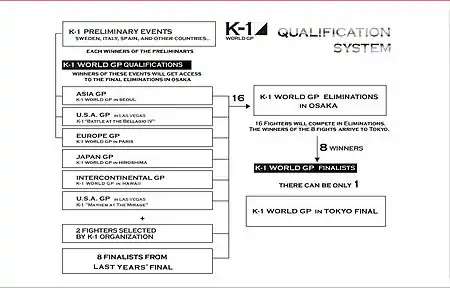 K-1 World Grand Prix, also known as the K-1 World GP, is an elimination kickboxing tournament that has been held annually since 1993 by the K-1 organization. Each year, K-1 holds various 16-men, 8-match grand prix style tournaments throughout the world to determine which 16 fighters will compete in the K-1 World GP. This tournament has had nine different winners with Ernesto Hoost and Semmy Schilt each winning four times.