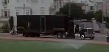 KITT has access to a mobile "garage" called the F.L.A.G. Mobile Command Center, which was a semi-trailer truck owned by the Foundation. In most episodes, it is a GMC General. The trailer has an extendable ramp that dropped down and allows KITT to drive inside even when the truck is in motion. The trailer was loaded with spare parts and equipment for KITT. It also had a computer lab where technicians Bonnie or April would work and conduct repairs and maintenance while in transit. In "KITTnap", KITT is kidnapped and Michael and RC3 use the tractor (which has been disconnected from the trailer) to go and find him.