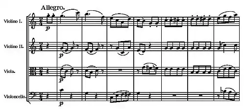 Listen) to use chromatic and whole tone scales to outline fourths. Arch shaped lines emphasizing fourths in the first violin (C – F – C) and the violoncello (G – C – C' – G') are combined with lines emphasizing fifths in the second violin and viola. Over the barline between the second and third measures of the example, a fourth-suspension can be seen in the second violin's tied C. In another of his string quartets, KV 464, such fourth-suspensions are also very prominent.