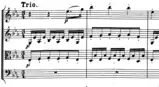The third movement is a minuet and trio with the tempo marking being moderato. The minuet is in B-flat major and the trio is in E-flat major. The first violin states the main thematic material of this movement and the other instruments accompany with ostinato figures. While the cello isn't given large thematic material as in the previous movements, the cello is given the final note of both sections of the trio without any other voice playing.