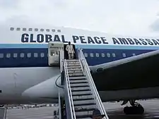 Through charitable contributions to his organization, Paul's backers provided funds to purchase a Boeing 747SP airplane that Paul named "Global Peace Ambassadors", which flew under the name "Global Peace One".[15] The airplane was formerly flown by China Airlines; it was the aircraft in the China Airlines Flight 006 accident. The airplane was used for missions to Third World countries, delivering disaster aid. A former crew member described it as a "flying death trap". The volunteer pilot, first officer, and flight engineer all quit in 2005 because of concerns over maintenance and non-payment of debts. The FAA eventually suspended the plane's operating certificate due to insufficient maintenance.[16] The aircraft is parked at Tijuana International Airport in Tijuana, Baja California, and is reported to be in poor condition with expired registration as of December 31, 2016.