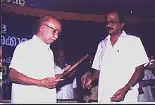 K. Surendran hands over the fellowship certificate awarded by Kerala Sahitya Akademi to M. T. Vasudevan Nair