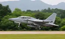 The FA-50 is the most advanced version of the T-50, possessing more internal fuel capacity, enhanced avionics, a longer radome, and a tactical datalink.[20] It is equipped with a modified Israeli EL/M-2032 pulse-Doppler radar with Korean-specific modifications by LIG Nex1.[21] The engine could be either Eurojet EJ200 or General Electric F414 with thrust of 89 to 98 kN (20,000 to 22,000 lbf), roughly 12–25% higher than the F404's thrust;[22][23] and are offered to prospective customers for the T-50. The radar of the FA-50 has a range two-thirds greater than the TA-50's radar.[24] The EL/M-2032 was initially chosen over Lockheed Martin's preferred AN/APG-67(V)4 and SELEX Vixen 500E active electronically scanned array (AESA) radars. Other AESA radars such as Raytheon's AN/APG-79 and Northrop Grumman's AN/APG-83 are options for future production,[25][26] and may be shared with the radar chosen for USAF and ROKAF F-16 fighters.[27] Samsung Thales is also independently developing a domestic multi-mode AESA radar for the FA-50.[28]