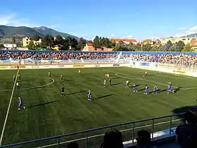 Once the club achieved promotion to the Albanian Superliga in 2012 the stadium did not meet the requirements needed to compete in the top flight, which led to further investment on the ground, which resulted in an intensive reconstruction program during the summer of 2012 in order to get the stadium ready for the 2012–13 season. The stadium was given a seated capacity of over 5,000 spectators and all the required amenities were added in order to meet the league requirements, and it was reopened on 1 October 2012 with a total reconstruction cost of €576,000.
