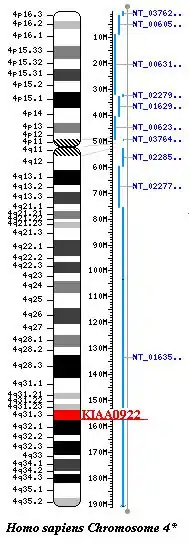 The KIAA0922 gene is found in the human genome at chromosomal location 4q31.3 on the plus strand and is 170,364 base pairs (bp) in length, spanning from 154,387,498 to 154,557,863[9] along chromosome 4 (NC_000004.11).[10] The gene has the aliases TMEM131L, FLJ10592, DKFZp586H1322, and LOC23240 [11] The gene includes 44 distinct introns (with an additional 6 probable non-overlapping alternative last exons).[11] The function of this gene is not yet fully understood.