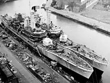 A twin 4.5-inch (113 mm) Mark 6 gun mount was fitted forward. Anti-aircraft defence was provided by two quadruple Sea Cat surface-to-air missile launchers on the hangar roof. A Limbo anti-submarine mortar was fitted aft to provide a short-range anti-submarine capability, while a hangar and helicopter deck allowed a single Westland Wasp helicopter to be operated, for longer range anti-submarine and anti-surface operations.[2][3]