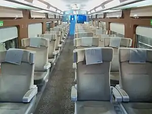 The third intermediate car offers elevated comfort First Class seating, the others Standard Class.[1] Swivelling seats, which can be rotated around at terminal stations so that they always face in the direction of travel, are installed in both classes, rather than only in First Class as on the KTX-I.[24] Compared to the KTX-I, seat distance was increased from 930 to 980 mm (36.61 to 38.58 in) to provide more leg room.[24] The fourth passenger car houses a snack bar and family compartments with separated facing seats.[1] Other passenger comfort features include wireless internet access and digital multimedia broadcasts,[3] and business compartments with small tables.[33] Like on the KTX-I, all passenger compartments are equipped with ceiling-mounted video displays, but 19" LCD screens are used instead of 17" ones.[23] Unlike those of the KTX-I,[23] the KTX-II passenger compartments were fitted with fire detectors.[27] Toilet doors were automatised,[23] and the toilet in the first passenger car is suited for disabled persons.[1]