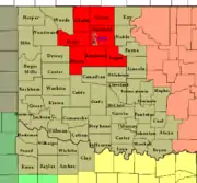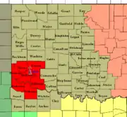 The Norman Weather Forecast Office – which operates as a branch of the National Weather Service's Southern Region Headquarters (SRH) division – manages three NEXRAD (WSR-88D) Doppler weather radar sites that cover its area of forecasting responsibility, based in Oklahoma City (radar identification code: TLX), serving central Oklahoma; Frederick (FDR), serving southwestern Oklahoma and western north Texas; and at Vance Air Force Base (VNX), serving north-central and northwestern parts of Oklahoma, and portions of southern Kansas.[2] The office has earned widespread recognition from local media outlets, especially in concern with certain weather conditions that are or are forecast to occur.[3][4] It has also received attention from national media, and was even recognized by United States President Barack Obama.[5][6][7]