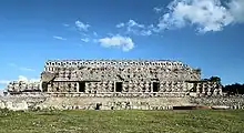 The site also has a number of other palaces, low stone buildings, and step pyramid temples. While most are in the Puuc Maya style, some show Chenes elements.[1] The site had a number of sculpted panels, lintels, and doorjambs, most of which have been removed to museums elsewhere. The sculptures mostly depict the site's rulers and scenes of warfare.