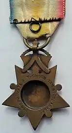 The medal is a bronze five-pointed star 62mm high and 48mm wide, suspended by the Imperial Crown. It was made from guns captured at the Battle of Kandahar.[7]