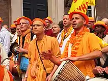 Kadamba Kanana Swami took sannyasa initiation[4] from his guru, Jayadvaita Swami,[5] in 1997 and now travels extensively around the world spreading the message of Lord Caitanya’s movement.[6] As a sannyasi, he had been active in a great variety of projects. He became deeply involved in South Africa and spent substantial time there from 1995 to 2023. In a country with a long history of apartheid, he built bridges between communities and in reaching out to- and in offering support the local African community in Krsna consciousness. He brought the Festival of Chariots to Soweto, where he observed local African people dancing in ecstasy in front of a tv which was playing Ratha Yatra kirtans from the Durban festival. This experience touched his heart and since then he wanted Soweto to have their own Ratha Yatra festival. The first place he was invited to after taking sannyasa was the Czech Republic, where he spent substantial time, and has quite a number of followers there. Radhadesh, in Belgium was started mostly by devotees from the Netherlands, so he had a natural connection there, he has been lecturing at the Bhaktivedanta College and leads the annual King's Day festival harinam, where hundreds of devotees take to the bustling streets of Amsterdam for a day of singing and dancing.[7] From 2000 to 2008 he has been leading the New Vrajamandala Farm, to save the farm from being sold. In recent years from 2017 to 2022 he has been involved in NYC the city from where Srila Prabhupada began a Worldwide mission to help the revival of the local temple. In 2001, Kadamba Kanana Swami began his service as an initiating spiritual master and has since then initiated about a thousand disciple across the globe.