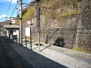 The station consists of a single ground-level island platform. The station is unattended, and there is no station building, but only a waiting room on the platform.