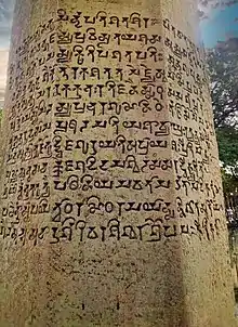 There is a 0.673 by 0.51 metres (2 ft 2.5 in by 1 ft 8.1 in) on the pillar with writing with characters belonging to eastern variety of Gupta alphabet similar to that of Samudragupta inscription of Allahabad Pillar. The inscription is written in Sanskrit language, and written in verses except for the first word, siddhaṁ.[8] The inscription defines reign of Skandagupta as peaceful and describes him as "commandar of a hundred kings".[9][10] The inscription also has an adoration to Arihant of Jainism.[2][5][11][12]