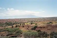 Kahoʻolawe (Hawaiian: [kəˈhoʔoˈlɐve]), anglicized as Kahoolawe (/kɑːˌhˈlɑːw, -v/[3]), is the smallest of the eight main volcanic islands in the Hawaiian Islands. Kahoʻolawe is about seven miles (11 km) southwest of Maui and also southeast of Lānaʻi, and it is 11 mi (18 km) long by 6.0 mi (9.7 km) wide, with a total land area of 44.97 sq mi (116.47 km2).[4] The highest point on Kahoʻolawe is the crater of Lua Makika, at the summit of Puʻu Moaulanui, about 1,477 feet (450 m) above sea level.[5] Kahoʻolawe is relatively dry (average annual rainfall is less than 65 cm or 26 in)[6] because the island's low elevation fails to generate much orographic precipitation from the northeastern trade winds, and Kahoʻolawe is in the rain shadow of eastern Maui's 10,023-foot-high (3,055 m) volcano, Haleakalā. More than one quarter of Kahoʻolawe has been eroded down to saprolitic hardpan soil, largely on exposed surfaces near the summit.